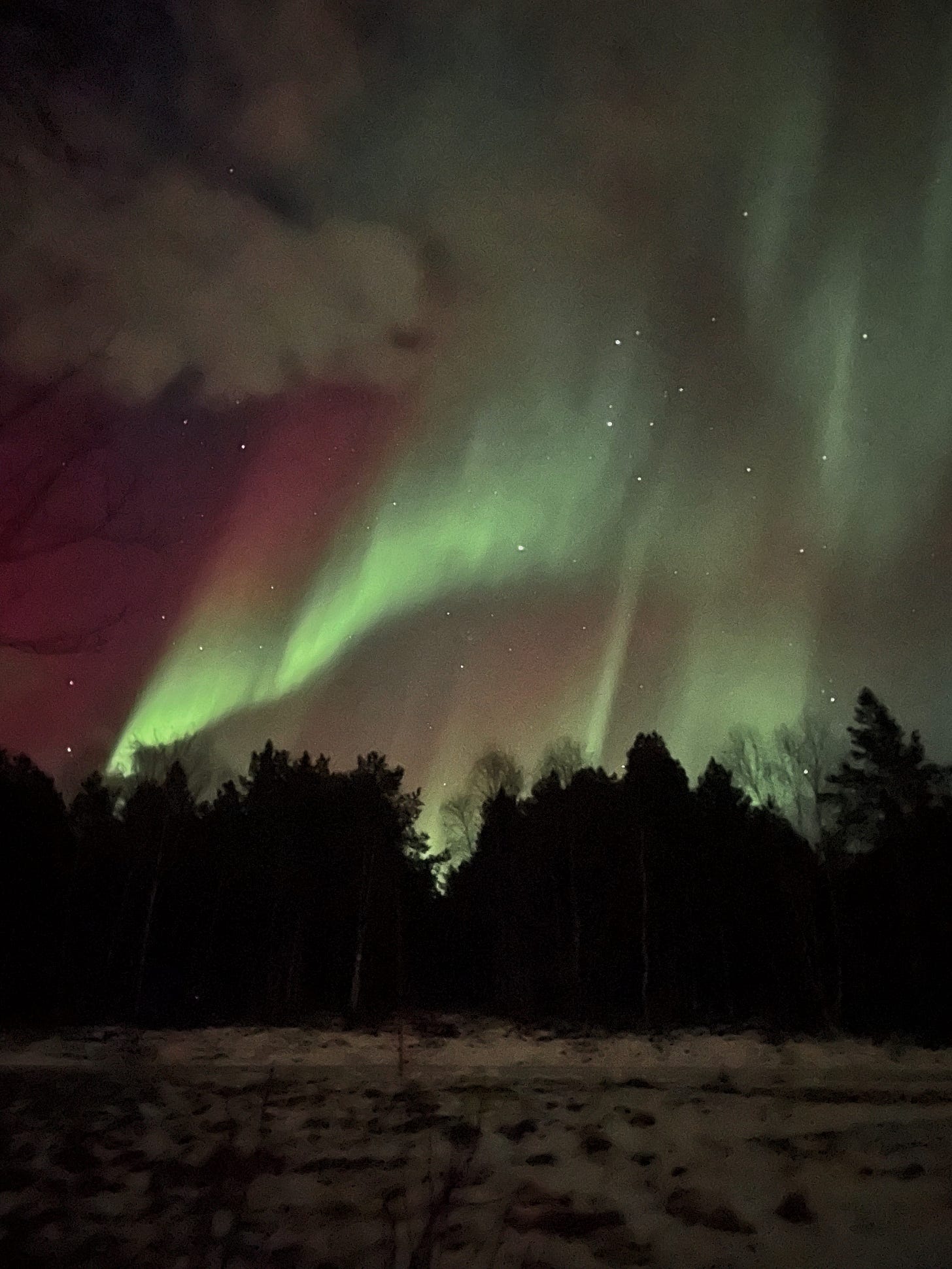 I spent Wednesday evening in a carpark in Essex, trying (and failing) to see the northern lights. It was a strange thing to do (although I suspect the people in the other cars nearby were doing even stranger things), but it was the second night of an unusually powerful solar flare, and so the chances of seeing the aurora in the UK were unusually high. It had happened the night before, too, while we all slept, only some people hadn’t slept, and I’d woken up to a newsfeed full of photos of skies - skies stretching from Alaska to the Alps, but also British skies - shining pink and blue and green. I had spent the day wracked with an agonising mixture of FOMO and yearning and hope, and persuaded S that an evening wild goose chase, away from London’s light pollution, might not be entirely in vain.